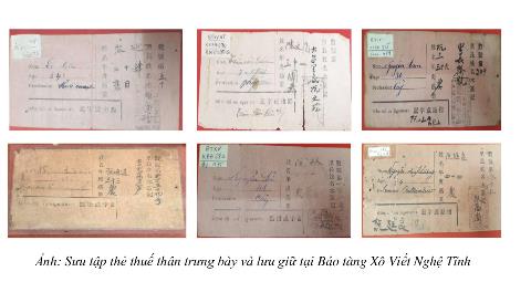 Thuế thân (thuế sưu, thuế đinh) là một trong những loại thuế khóa có từ thời phong kiến đã được thực dân Pháp tận dụng triệt để để bóc lột nhân dân Việt Nam và là nguồn thu chính cho ngân quỹ nhà nước, phục vụ cho công cuộc khai thác thuộc địa ở Đông Dương. Bảo tàng Xô Viết Nghệ Tĩnh hiện đang trưng bày, lưu giữ và phát huy giá trị nhiều sưu tập độc đáo, đặc biệt phải kể đến bộ sưu tập hiện vật thẻ thuế thân trước năm 1945. Bộ sưu tập gồm 06 hiện vật, có mốc thời gian từ năm 1931 cho đến năm 1942, nằm trong giai đoạn thực dân Pháp áp dụng thuế thân ở Việt Nam. Những hiện vật này là kết quả của một quá trình sưu tầm lâu dài của cán bộ bảo tàng.