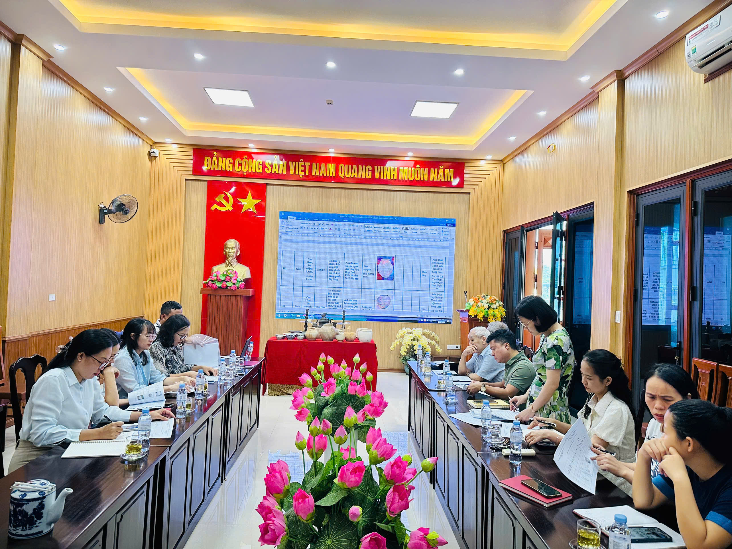 Tham dự cuộc họp có các chuyên gia đầu ngành trong lĩnh vực bảo tàng học và di sản văn hóa, gồm: GS.TS Phạm Quốc Quân, nguyên Giám đốc Bảo tàng Cách mạng Việt Nam, thành viên Hội đồng Di sản Quốc gia; TS Nguyễn Đình Chiến, nguyên Phó Giám đốc Bảo tàng Lịch sử Việt Nam, thành viên Hội đồng Giám định Cổ vật Quốc gia; TS Trương Đắc Chiến, cán bộ Phòng Nghiên cứu - Sưu tầm, Bảo tàng Lịch sử Quốc gia.Cùng tham dự còn có đại diện Phòng Quản lý Di sản Văn hóa – Sở Văn hóa, Thể thao và Du lịch Nghệ An.