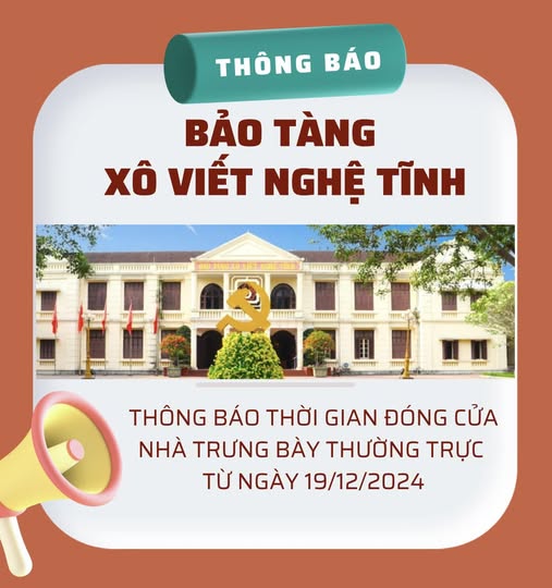 Từ ngày 19/12/2024, Bảo tàng Xô Viết Nghệ Tĩnh ngừng phục vụ đón tiếp khách tham quan để thực hiện Dự án nâng cấp, chỉnh lý nội dung tại Nhà trưng bày thường trực...