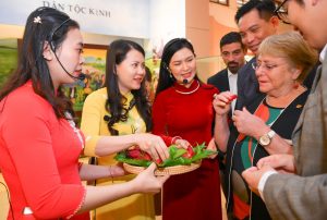 Bà Michelle Bachelet - cựu Tổng thống Chile trải nghiệm trầu têm cánh phượng theo phong tục của Việt Nam. Ảnh: Thành Cường