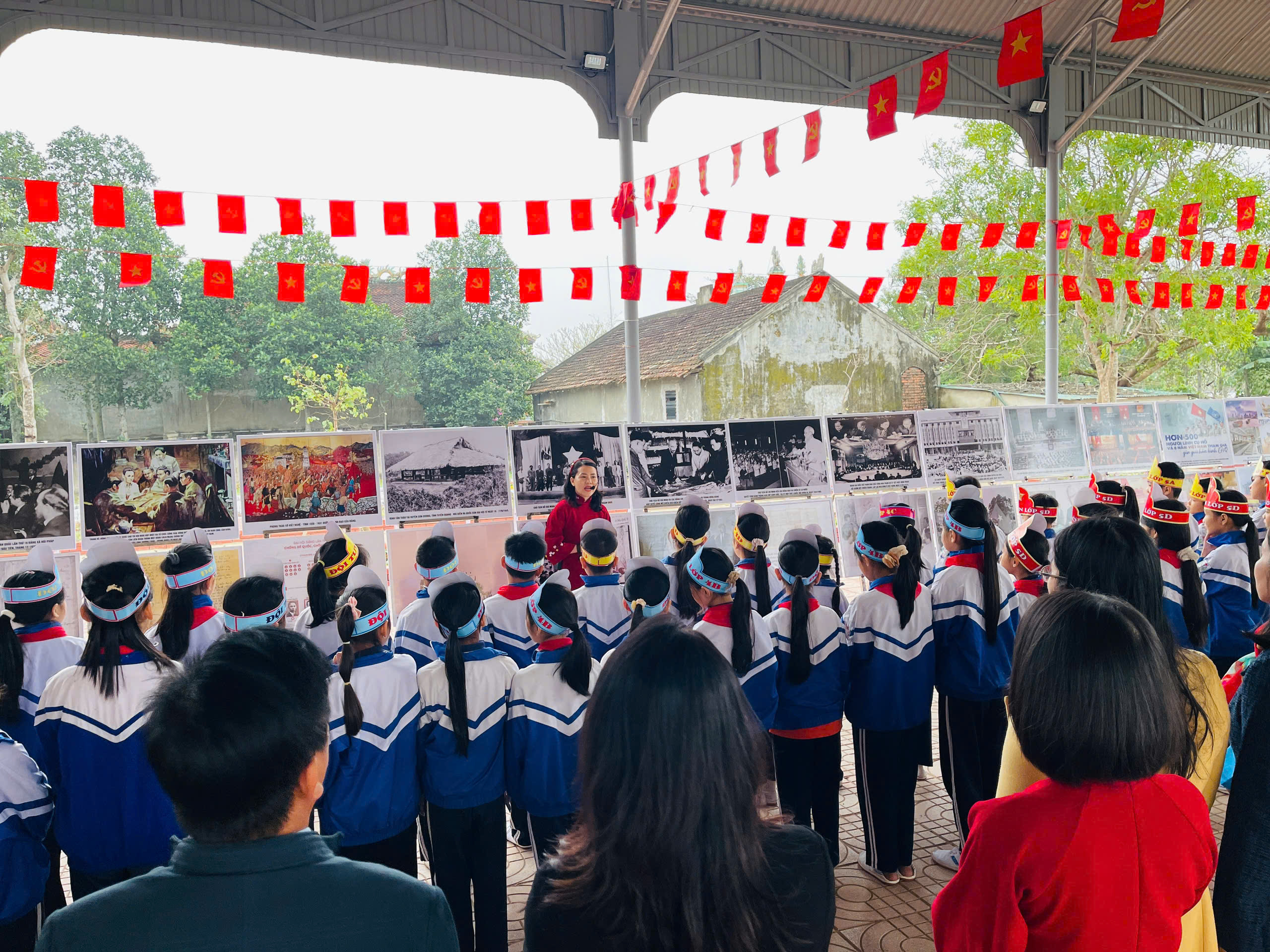 Giáo viên và học sinh trường Tiểu học Trung Phúc Cường chăm chú lắng nghe thuyết minh viên giới thiệu chuyên đề: “ Đảng Cộng sản Việt nam – Tự hào những mùa xuân lịch sử”