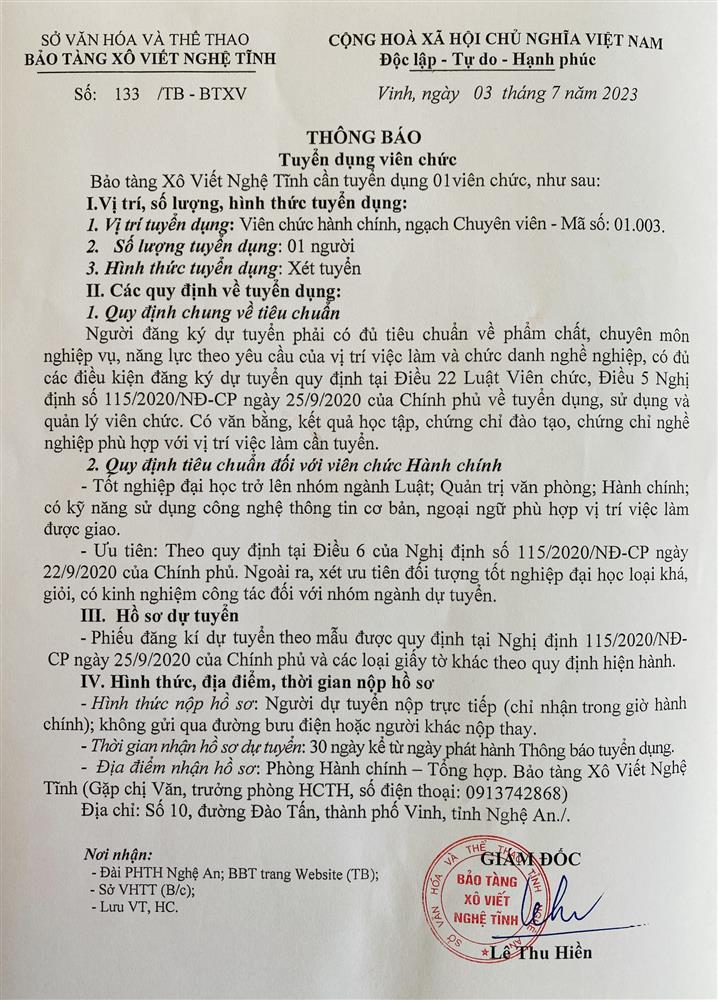 BẢO TÀNG XÔ VIẾT NGHỆ TĨNH THÔNG BÁO TUYỂN DỤNG VIÊN CHỨC