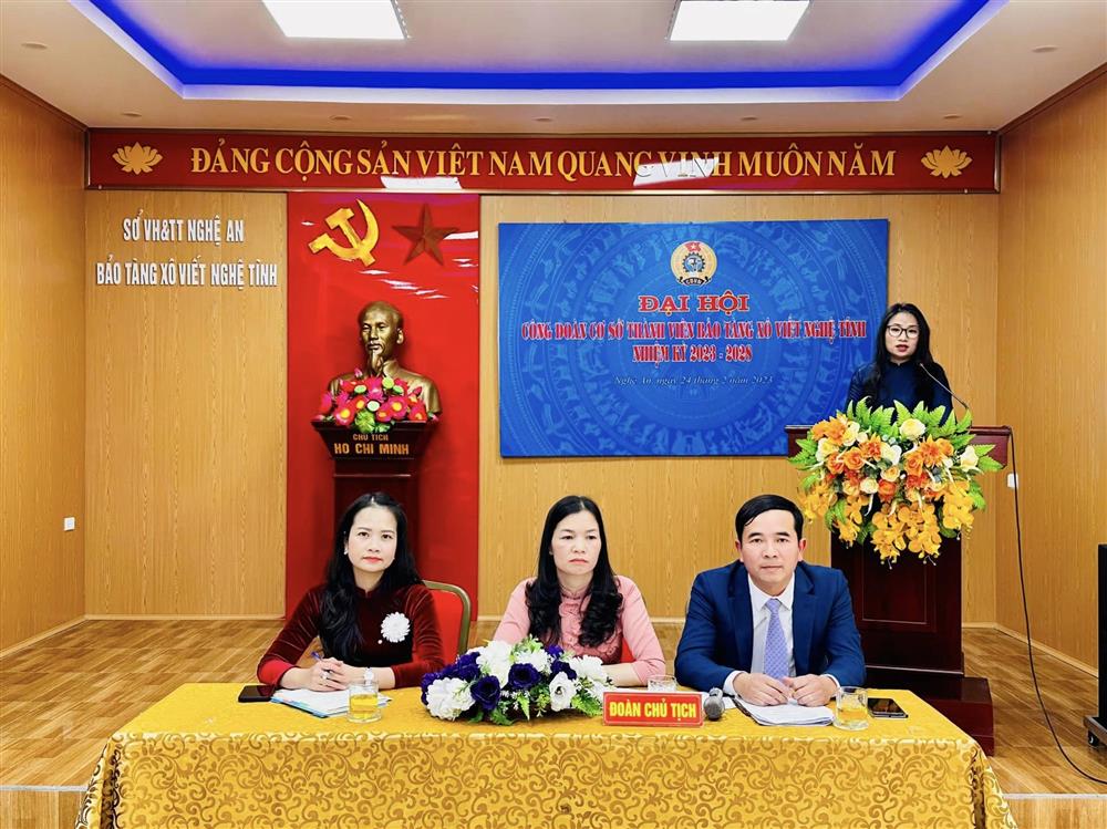 Chiều ngày 24/02/2023, Công đoàn cơ sở thành viên Bảo tàng Xô Viết Nghệ Tĩnh đã tổ chức thành công Đại hội nhiệm kỳ 2023 - 2028. Tham dự Đại hội có đồng chí Nguyễn Thị Thu Thuỷ - Phó Chủ tịch Công đoàn cơ sở Sở Văn hoá Thể Thao, đ/c Vũ Văn Nam - UV Ban Thường vụ Công đoàn cơ sở Sở Văn hoá Thể Thao và toàn thể đoàn viên Bảo tàng Xô Viết Nghệ Tĩnh.