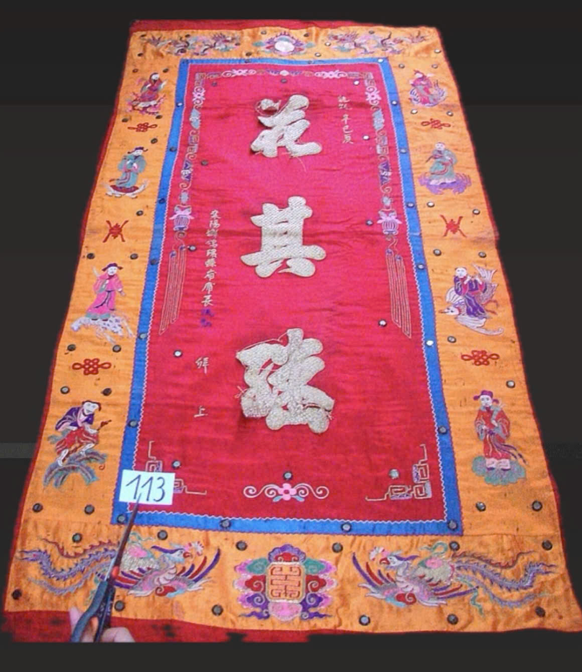 Trong bộ sưu tập Tranh thêu hình tượng Rùa (Quy) được thêu ở diềm các bức trướng có số hiệu V.113, 114, 115,116 với hình ảnh ông tiên đứng trên lưng rùa là biểu tượng của sự trường thọ, ổn định, vững chãi, bảo vệ hộ mệnh, hòa hợp trời đất ghi nhớ và lưu truyền.