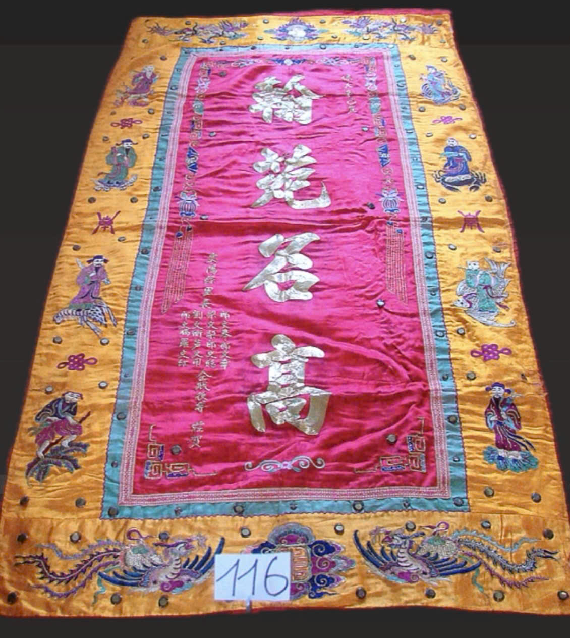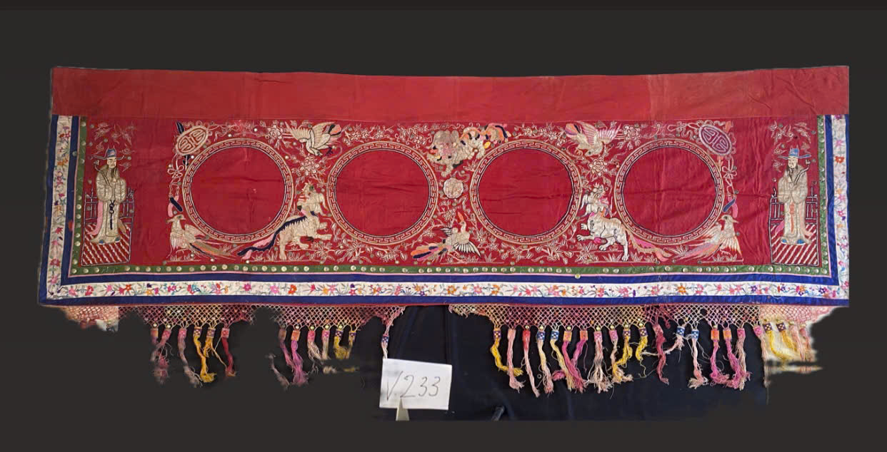 Bức tranh số 2 trung tâm là 4 khung tròn viền hồi văn hiện để trống (trước đây có thể thêu hoặc dán chữ Phúc- Lộc - Thọ - Hỷ) – Các khung tròn rỗng linh hoạt để chèn nội dung phù hợp với từng dịp. Xen kẽ là hình ảnh Phượng và Kỳ lân bố trí luân phiên nhau, hai đầu Hoành phi thêu hình nhân vật mặc triều phục, đóng vai trò trấn trạch, viền ngoài nhiều lớp, mép dưới có tua rua nhiều màu. Chim Phượng tượng trưng cho vinh hoa, quý khí, hòa hợp âm dương, mang vận may đến cho chủ nhân, Kỳ lân tượng trưng cho điềm lành, trừ tà và bảo vệ. Sự kết hợp này vừa thu hút may mắn vừa bảo vệ không gian nghi lễ. Bức hoành phi này phù hợp dùng trong lễ cưới, lễ mừng thọ, nghi thức thờ cúng.