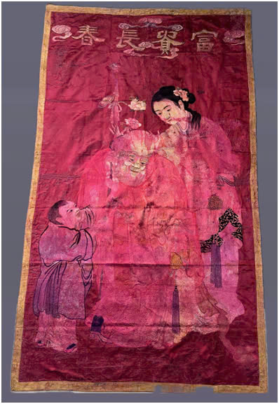 Bức số 1 “Phú quý trường xuân” (có nghĩa giàu sang phú quý mong ước cuộc sống lâu dài tươi mới như mùa xuân) là tác phẩm nghệ thuật thời phong kiến ở Nghệ An, dùng để trang trí. Tranh thêu hình ông Thọ trên nền vải đỏ có nhiều chữ thọ, tay cầm bình rượu và gậy trúc. Bên phải là một cô gái trẻ đẹp có mái tóc đen nhánh, đứng bên trái là một cậu bé nâng cành hoa tặng ông. Bức tranh này thường được treo trong gia đình như phòng khách, gian thờ gia tiên, phòng cưới mang ý nghĩa chúc tụng hạnh phúc, sung túc, con cháu đề huề, được dùng trong dịp cưới hỏi, mừng con cháu, mừng Tết.
