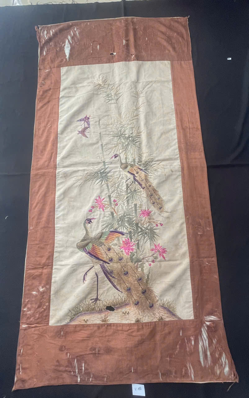 Hai bức tranh này thêu nổi bật hình ảnh hai con chim công đang sánh đôi bên khóm trúc xanh và những đóa mẫu đơn rực rỡ. Trên nền vải vàng và trắng ngà, từng đường kim mũi chỉ được thể hiện một cách tinh xảo mang đậm tính nghệ thuật dân gian. Chim công là biểu tượng của phú quý, quyền lực và sắc đẹp cũng là điềm lành, thể hiện sự cao sang, danh vọng và hạnh phúc trong hôn nhân. Hoa mẫu đơn đại diện cho sự giàu sang, thịnh vượng, còn cây trúc thể hiện phẩm chất kiên cường, ngay thẳng của người quân tử.