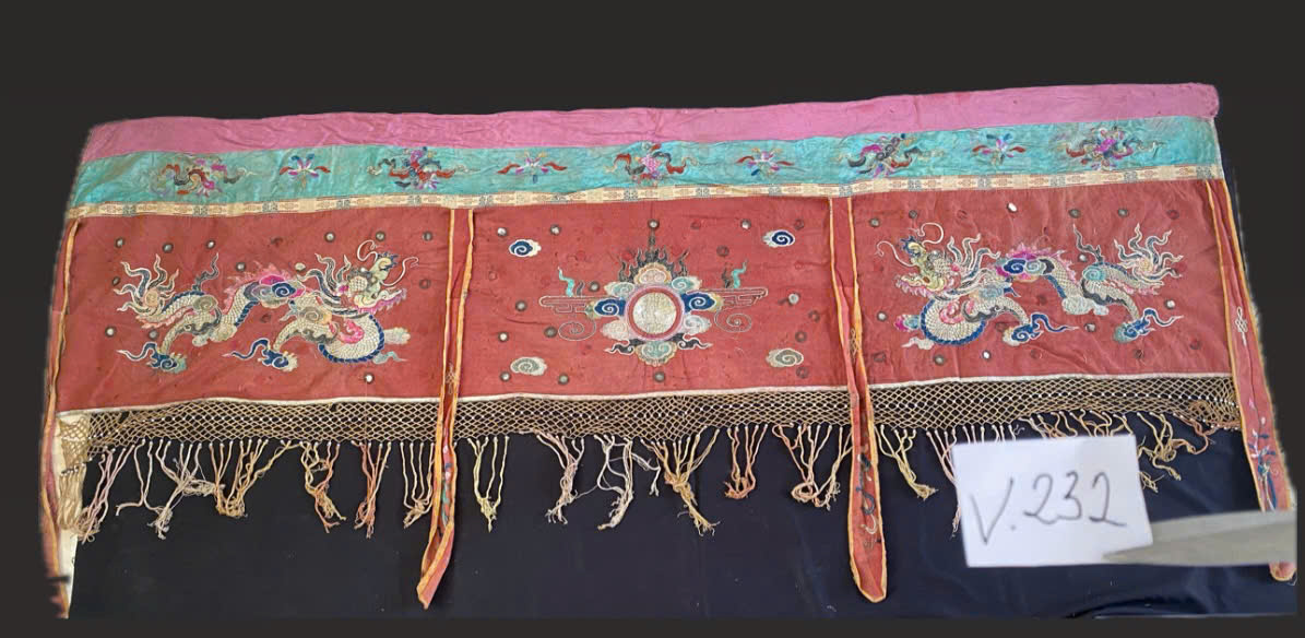 Đây là hai bức tranh thêu nổi bật hình ảnh “Lưỡng long chầu mặt trời”. Hình ảnh hai con rồng đối xứng, thân uốn lượn mềm mại, mắt tròn sáng, râu dài, mào dựng, vảy đều tăm tắp, đang hướng về hình tròn rực rỡ ở chính giữa – biểu tượng của Mặt trời. Mây cuộn bao quanh, tạo cảm giác linh thiêng và huyền ảo. Trong văn hóa phương Đông, Rồng là con vật linh thiêng đứng đầu tứ linh (Long - Ly- Quy - Phượng) tượng trưng cho quyền lực, sự thịnh vượng và mưa gió thuận hòa. Mặt trời tượng trưng cho nguồn sáng, trí tuệ và vương quyền. Khi hai con rồng cùng chầu về hướng mặt trời đó là hình ảnh quy tụ quyền lực và trí tuệ về trung tâm, tượng trưng cho lòng trung thành, sự đoàn kết và kính ngưỡng đối với bậc minh quân. Đồng thời hình ảnh Lưỡng long chầu mặt trời thể hiện sự cân bằng, hài hòa gợi nhắc con cháu giữ gìn đoàn kết. Mặt trời ở trung tâm tượng trưng cho lý tưởng và danh vọng mà gia tộc muốn hướng tới.