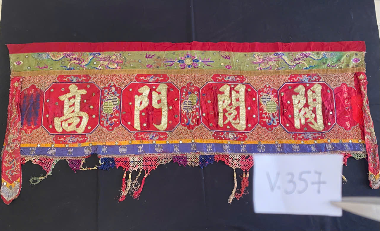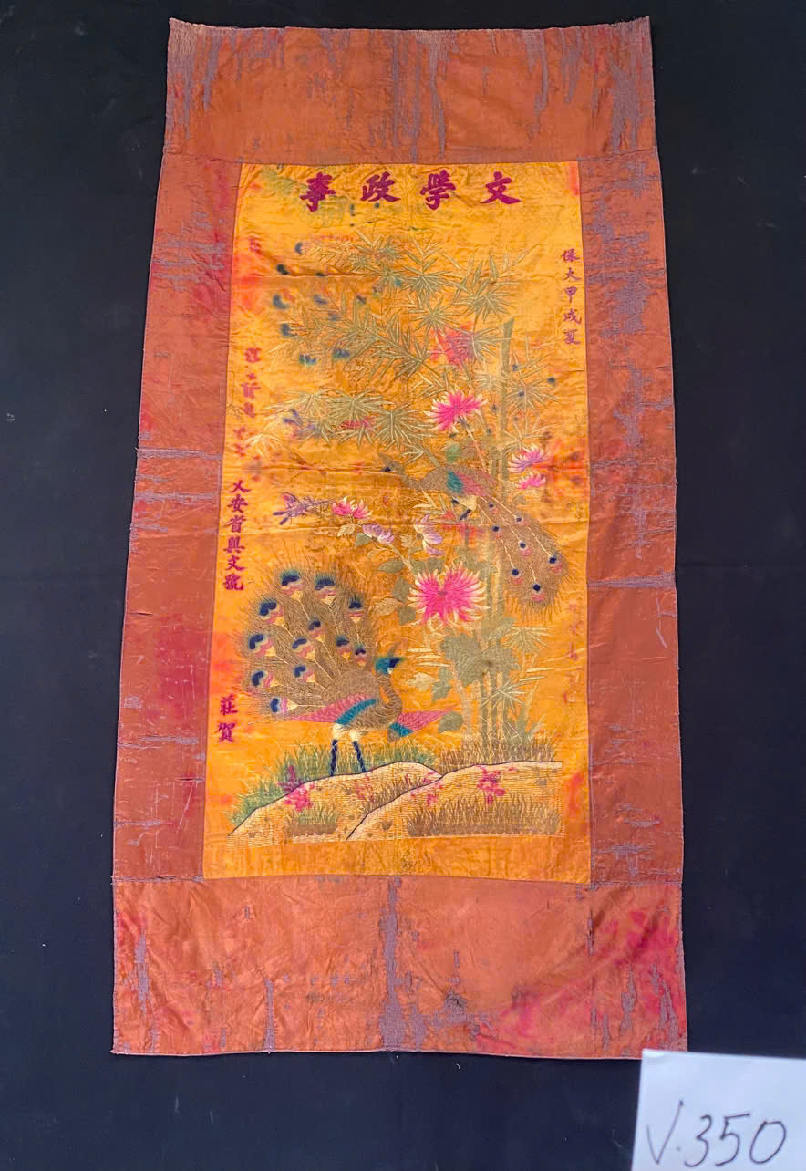 Trên bức tranh mang số hiệu V.350 có thêu 4 chữ Hán lớn có phiên âm: Văn học chính sự, dịch nghĩa: Chuyên việc văn học. Bằng chỉ thêu màu tím, phía trên bên phải thêu 5 chữ Hán nhỏ có phiên âm: Bảo Đại Giáp Tuất hạ, dịch nghĩa: Bảo Đại mùa hạ năm Giáp Tuất (1934). Phía dưới bên trái thêu 8 chữ hán nhỏ có phiên âm: Nghệ An tỉnh Hưng Văn Hiệu tráng hạ.... dịch nghĩa: Hiệu Hưng Văn tỉnh Nghệ An kính mừng. Diềm ngoài làm bằng vải lụa màu nâu.Tất cả hòa quyện tạo nên một tổng thể hài hòa, sang trọng, giàu tính biểu tượng, thường được treo trong không gian trang trọng như phòng khách, phòng thờ hay dùng làm quà tặng trong dịp mừng thọ, cưới hỏi.
