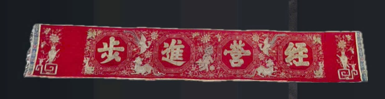Bức tranh số 1 ở trung tâm thêu 4 chữ Hán lớn có nội dung “Kinh doanh tiến bộ” xen giữa và bao quanh các chữ Hán thêu hình ảnh chim Phượng và Kỳ lân bố trí đối xứng nhau trên nền vải màu đỏ, chỉ vàng và trắng, viền trang trí hoa lá và họa tiết cát tường. Hình ảnh Phượng biểu tượng cho sự thịnh vượng, danh tiếng và thuận lợi song hành cũng ngữ cảnh này là nâng tầm thương hiệu mở rộng uy tín. Kỳ Lân biểu tượng bảo hộ, phúc lộc bền vững đặt cạnh chữ Kinh doanh tiến bộ với hàm ý giữ vững nền tảng khi phát triển. Sự kết hợp giữa hai hình ảnh Phượng và Lân cùng 4 chữ hán này là để gửi gắm lời chúc cơ nghiệp phát triển, tiến lên từng bước đồng thời an toàn bền lâu. Bức Hoành phi này dùng để treo trong cửa hàng, xưởng nghề, dịp khai trương vừa có chức năng trang trí, vừa mang ý nghĩa cầu chúc kinh doanh phát đạt.