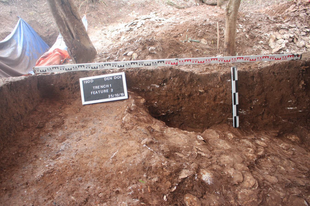 Trong cuộc khai quật 2019, qua quan sát tầng văn hóa có thể nhận thấy tầng văn hóa gồm các lớp đất và lớp điệp sò xen kẽ nhau, trong đó loại điệp sò không phải loại vỏ trong trạng thái tự nhiên của điệp sò mà là những mảnh vỏ rời rạc bị vứt ra sau khi con người lấy lõi thịt. Lớp đất mặt gồm lớp đất xen lẫn các lớp vỏ điệp sò mỏng nằm trực tiếp trên lớp trầm tích mùn tự nhiên. Sự tạo thành tầng văn hóa do tác động nâng cao mặt bằng của con người bằng cách sử dụng các lớp vỏ điệp rải đều làm nền cứng và sau đó trải trầm tích mùn bùn lên trên. Vì vậy lớp điệp sò này được tạo thành do con người và có tác dụng như một dạng vật liệu kiến trúc.