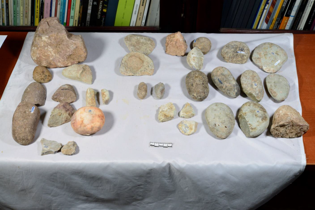Hiện vật đá thu được trong cuộc khai quật lần này đa dạng hơn cuộc khai quật trước cả về loại hình và số lượng. Về công cụ sản xuất, tại hố khai quật thu được 5/22 công cụ sản xuất bằng đá gồm: 2 bàn mài, 1 đá có lỗ vũm, 1 hòn đập và 1 chày tay. Tại hố thám sát thu được 1 đá có lỗ vũm. Các hiện vật đá còn lại là đá nguyên liệu thu được ở rải rác các hố. Các tiêu bản bàn mài được chế tác từ chất liệu đá phiến và sa thạch. Cả hai mảnh bàn mài đều được sử dụng ở dạng đá tự nhiên thô không qua chế tác. Các tiêu bản đá có lỗ vũm còn khá nguyên dáng, có chất liệu sa thạch. Hình dạng và kích thước các hiện vật đá có lỗ vũm chênh lệch nhau khá lớn. Các tiêu bản đá có lỗ vũm được tìm thấy mang đặc điểm của loại hình đá có lỗ vũm văn hóa Hòa Bình. Hòn đập có chất liệu Quartzite, còn nguyên dáng. Tiêu bản chày nghiền tìm thấy trên thân hiện vật gồm nhiều vết vỡ không có chủ ý. Dấu vết sử dụng ở một mặt, là vết mài mờ. Tiêu bản chày nghiền tìm thấy ở lớp địa tầng thấp nhất của hố khai quật, bên trong lớp điệp sò.