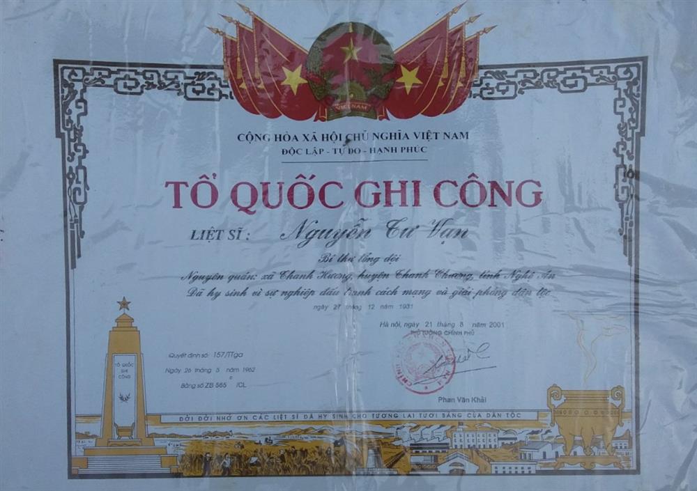 Ảnh: Bằng Tổ quốc ghi công của đồng chí Nguyễn Tư Vạn