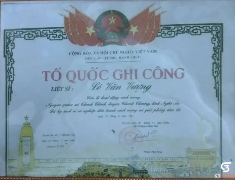 Ảnh: Bằng Tổ quốc ghi công của đồng chí Lê Văn Vượng