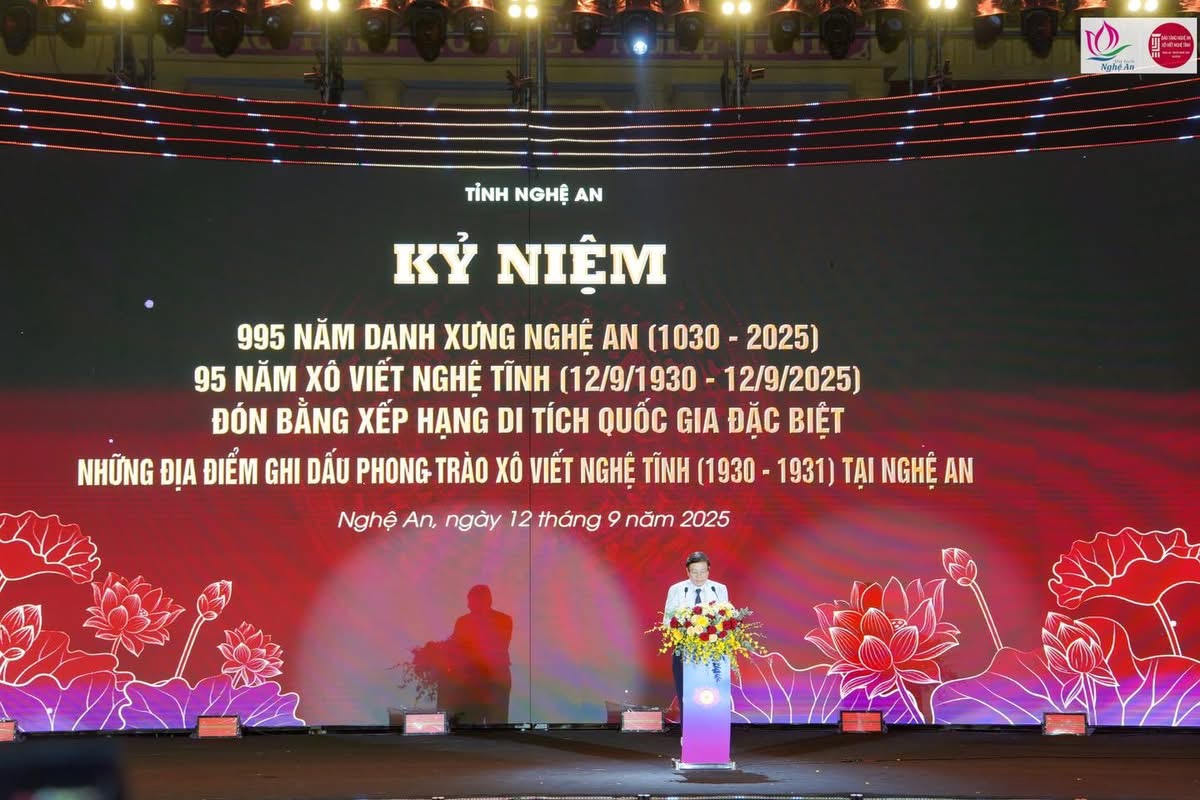 Tối 12/9, tại Bảo tàng Nghệ An – Xô viết Nghệ Tĩnh (số 10, đường Đào Tấn, phường Thành Vinh), tỉnh Nghệ An đã long trọng tổ chức Lễ kỷ niệm 995 năm danh xưng Nghệ An (1030 – 2025), 95 năm Xô viết Nghệ Tĩnh (12/9/1930 – 12/9/2025), đón nhận Bằng xếp hạng Di tích quốc gia đặc biệt “Những địa điểm ghi dấu Phong trào Xô viết Nghệ Tĩnh (1930-1931) tại Nghệ An” và ra mắt show trải nghiệm đêm “Lửa Xô viết”.