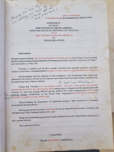 Tiếp đó là Bản dự thảo mà phía Mỹ trao cho Việt Nam vào tháng 4 năm 1997 và của Việt Nam tháng 5 năm 1998. Trong đó có 2 màu mực đen và đỏ. Chữ màu đen là dự thảo của Mỹ, chữ màu đỏ là dự thảo của Việt Nam, nhiều trang có bút tích của ông Nguyễn Đình Lương sửa chữa chằng chịt thể hiện quan điểm của Việt Nam đối với những điều khoản mà phía Mỹ phác thảo. Lý giải về điều này, ông Nguyễn Đình Lương chia sẻ, tại thời điểm ấy, Mỹ là nước có nền kinh tế thị trường phát triển nhất thế giới, họ có quyền chi phối luật chơi, quy định WTO sao có lợi nhất cho doanh nghiệp Mỹ. Trong khi Việt Nam là quốc gia có trình độ kinh tế phát triển thấp, vừa đặt chân vào thế giới hội nhập, chưa thể lường hết những nguy hiểm, bất trắc ngay phía trước. Vì thế trong bản thảo này, hầu như trang nào cũng được sửa lại, có chương như Thương mại dịch vụ Việt Nam ông Nguyễn Đình Lương viết lại hoàn toàn để đảm bảo được lợi ích của cả hai bên.