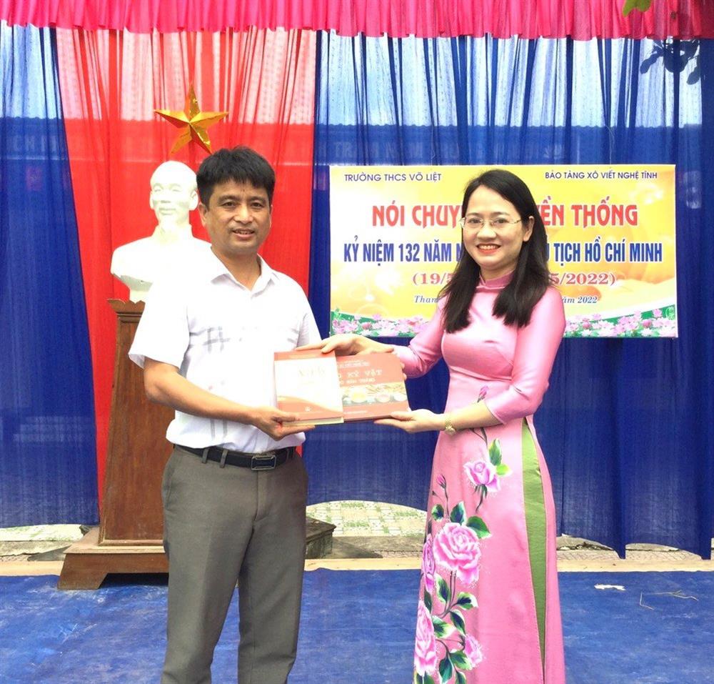 Đại diện lãnh đạo Bảo tàng Xô viết Nghệ Tĩnh trao tặng trường các ấn phẩm Hồi ký cách mạng do Bảo tàng xuất bản