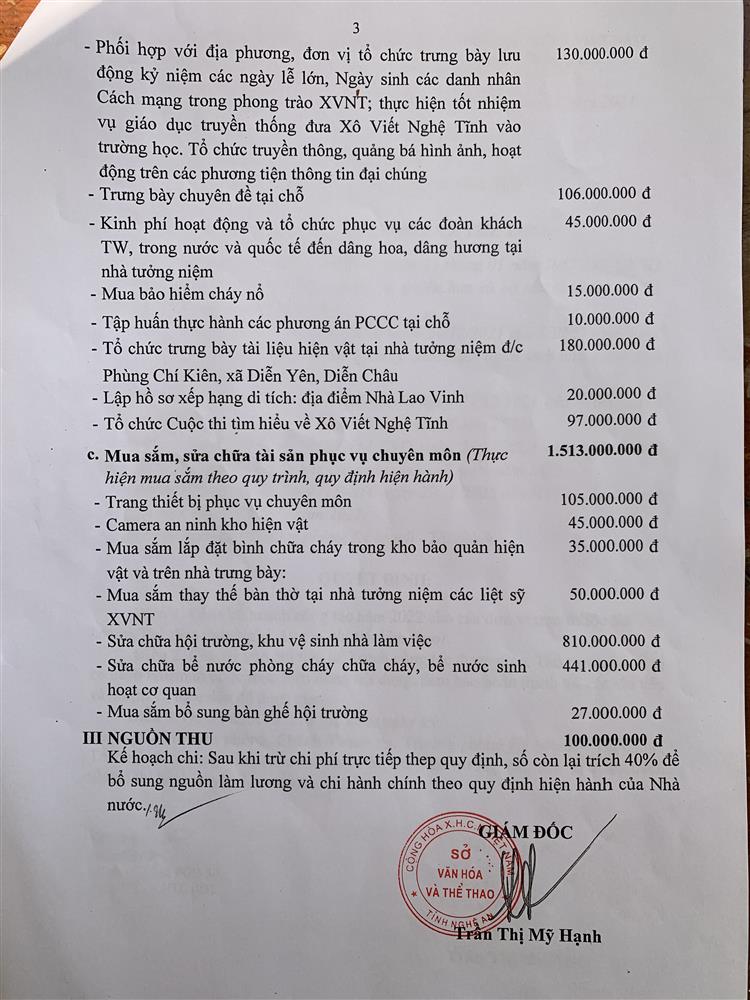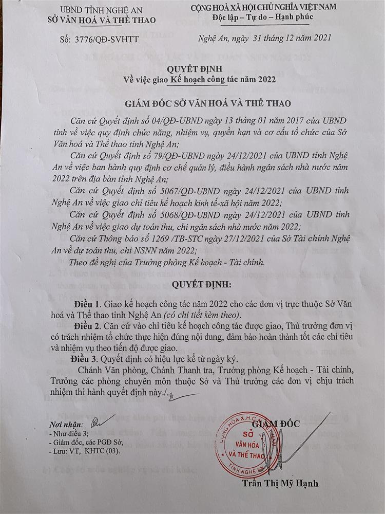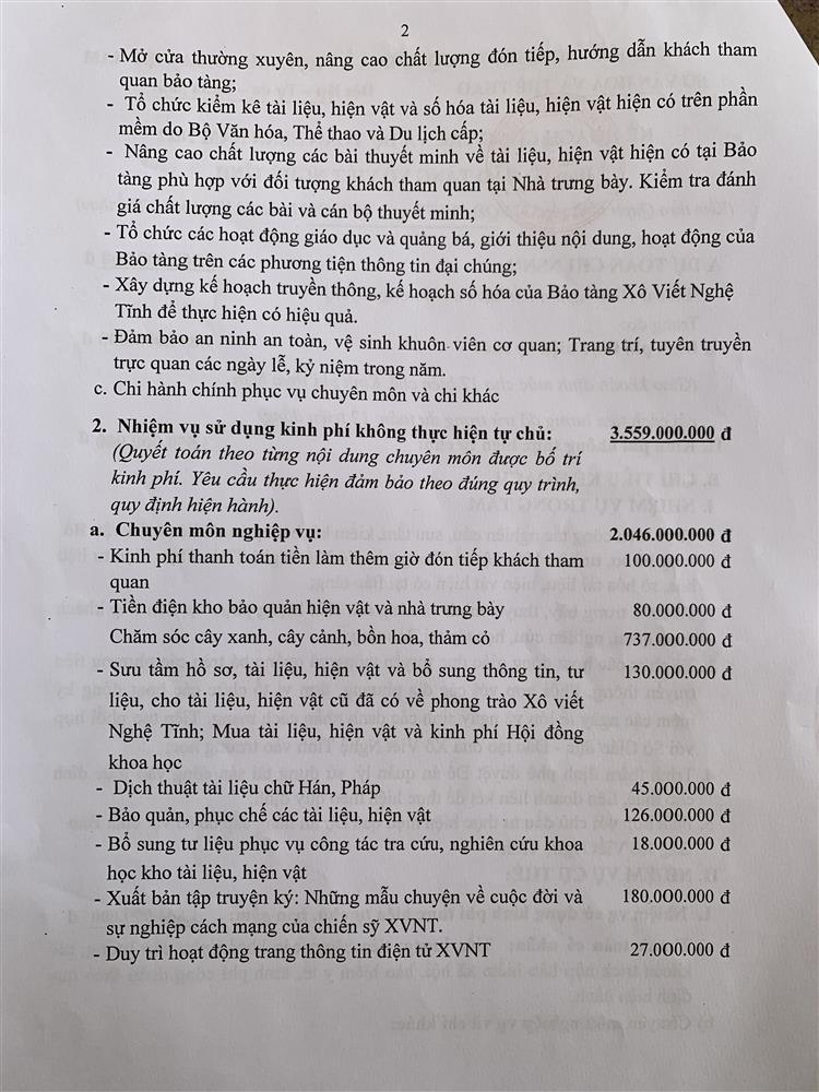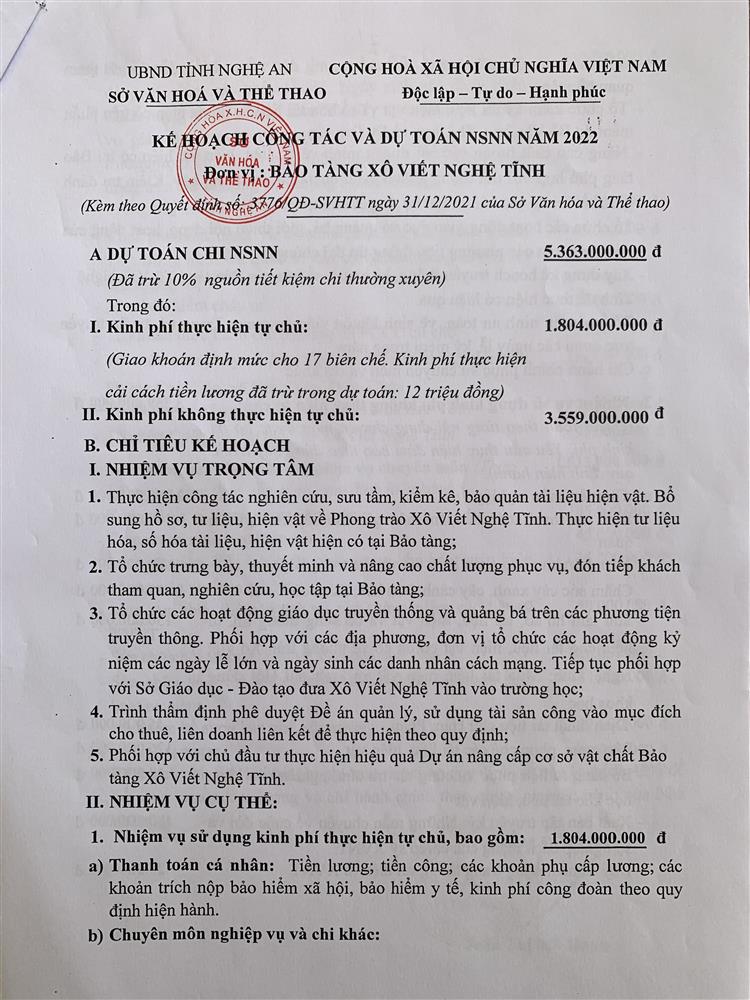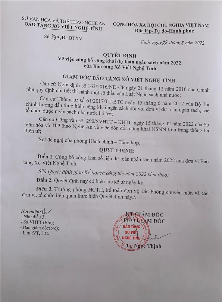 Quyết định về việc công bố công khai dự toán ngân sách năm 2022 của Bảo tàng Xô Viết Nghệ Tĩnh