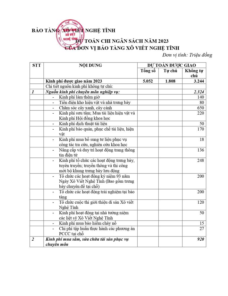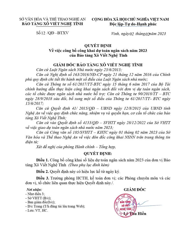 Bảo tàng Xô Viết Nghệ Tĩnh ra Quyết định Về việc công bố công khai dự toán ngân sách năm 2023: